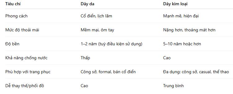 Hãy cân nhắc kỹ mục đích sử dụng và trải nghiệm thực tế để chọn được chất liệu dây đeo phù hợp nhất, giúp chiếc đồng hồ trở thành người bạn đồng hành đích thực trên cổ tay bạn.